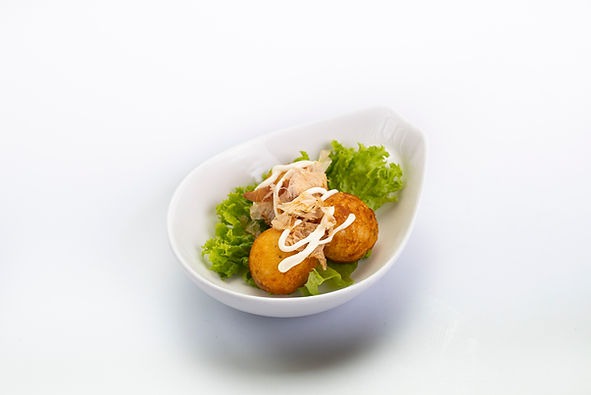 FestivoPolpette giapponesi in pastella di polipo condito con fiocchi di tonnetto affumicati e salsa mayo.