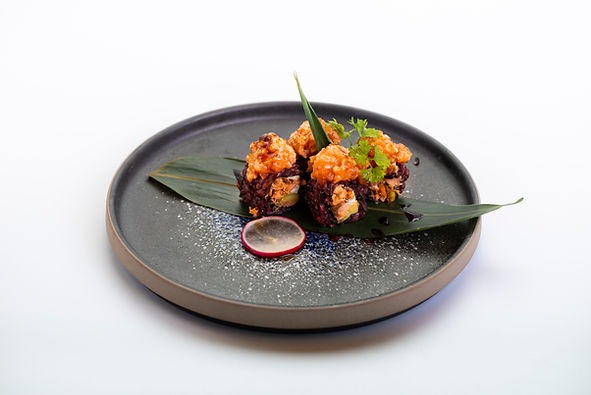 Roll di riso venere farcito con maionese gamberoni fritti, kataifi e salsa teriyaki.Allergeni